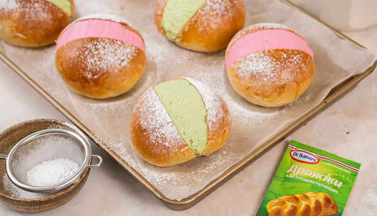 Булочки надрезаем по центру, но не разрезаем полностью. Оба вида крема перекладываем в кондитерские мешки. Заполняем булочки кремом. Все готово! Можно подавать! #ГотовьЛюбовь #МагияДрожжей