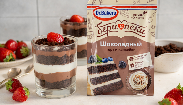 Собираем трайфл. На дно стаканчика выкладываем бисквит, добавляем слой шоколадного и белого крема. Далее опять бисквит. Чередуем слои до верха стаканчика. Украшаем десерт клубникой (10 шт.).