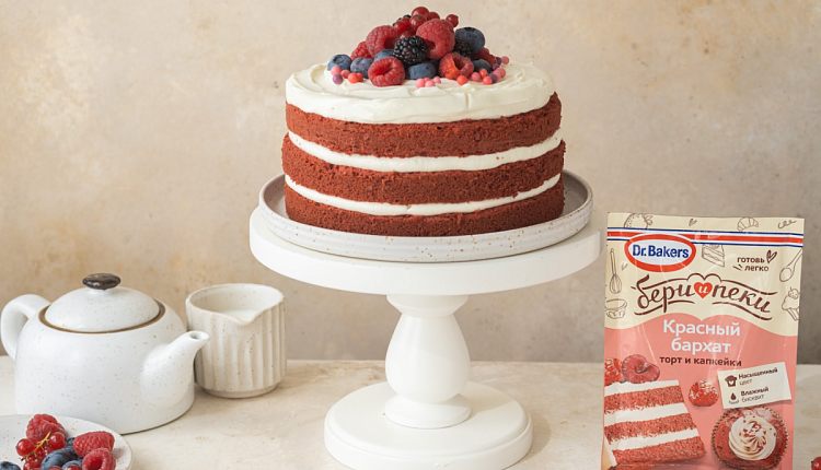 Собираем торт. На первый корж наносим слой крема с помощью кондитерского мешка. Накрываем вторым коржом, снова промазываем кремом и накрываем третьим. Украшаем оставшимся кремом, ягодами* и посыпкой «Лесные ягоды» Dr. Bakers.* Голубика, ежевика, малина, красная смородина.