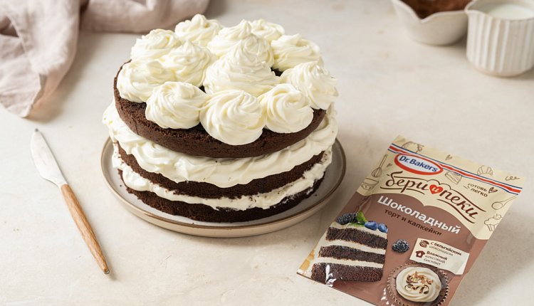 Смешиваем муку (110 г), сахар (150 г), смесь «Бери и пеки» для шоколадного торта Dr. Bakers (1 уп.), яйцо (3 шт.) и сливочное масло (150 г) комнатной температуры.